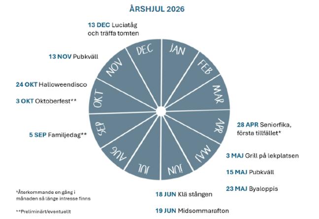 Genom att anordna bland annat pubkvällar, cykelfester, Midsommarfirande, Luciatåg och Barndisco med mera vill vi skapa ett starkt band och minnen för livet.